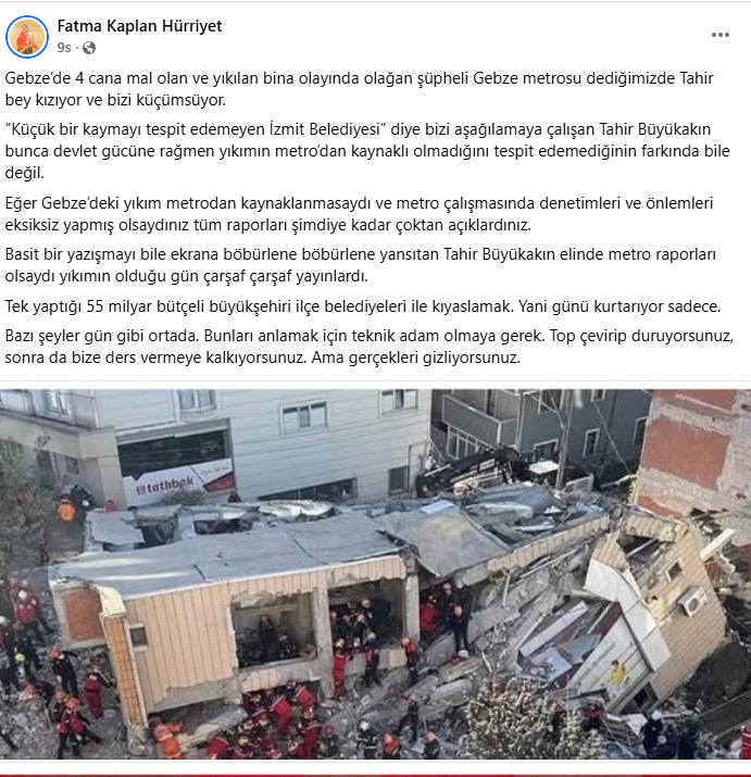 Fatma Başkan yaptığı açıklamada, “Gebze’de 4 cana mal olan ve yıkılan bina olayında olağan şüpheli Gebze metrosu dediğimizde Tahir bey kızıyor ve bizi küçümsüyor. “Küçük bir kaymayı tespit edemeyen İzmit Belediyesi” diye bizi aşağılamaya çalışan Tahir Büyükakın bunca devlet gücüne rağmen yıkımın metro’dan kaynaklı olmadığını tespit edemediğinin farkında bile değil.